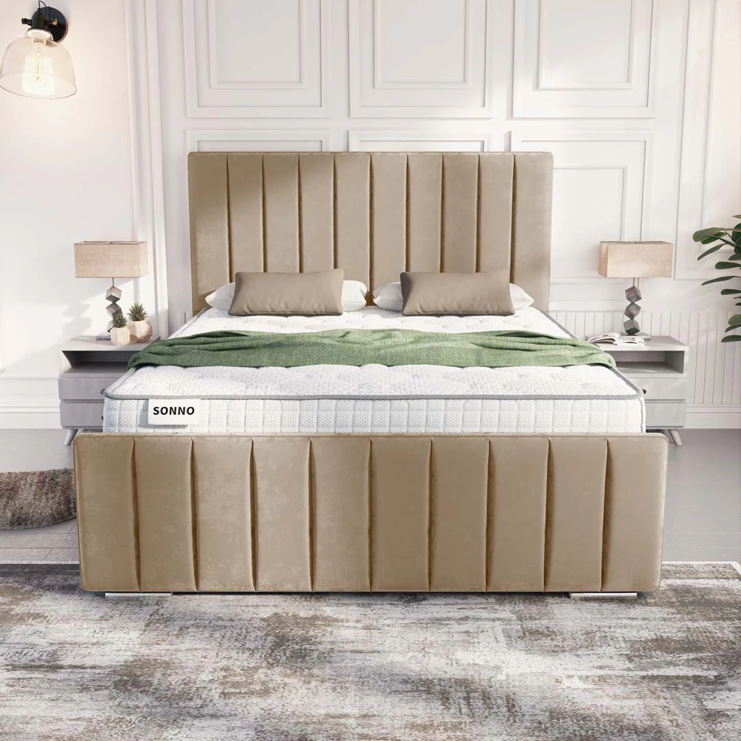 The Lisbon Upholstered Bed is the embodiment of modern sophistication. Designed for those who appreciate clean, symmetrical lines, it features a stunning Panel Line design on both the towering headboard and the matching footboard. This architectural approach creates a sense of order and calm in the bedroom, while the deep padding ensures a soft, luxurious feel. Hand-finished in the UK, the Lisbon is a statement piece that brings a high-fashion, boutique-hotel aesthetic to your home.