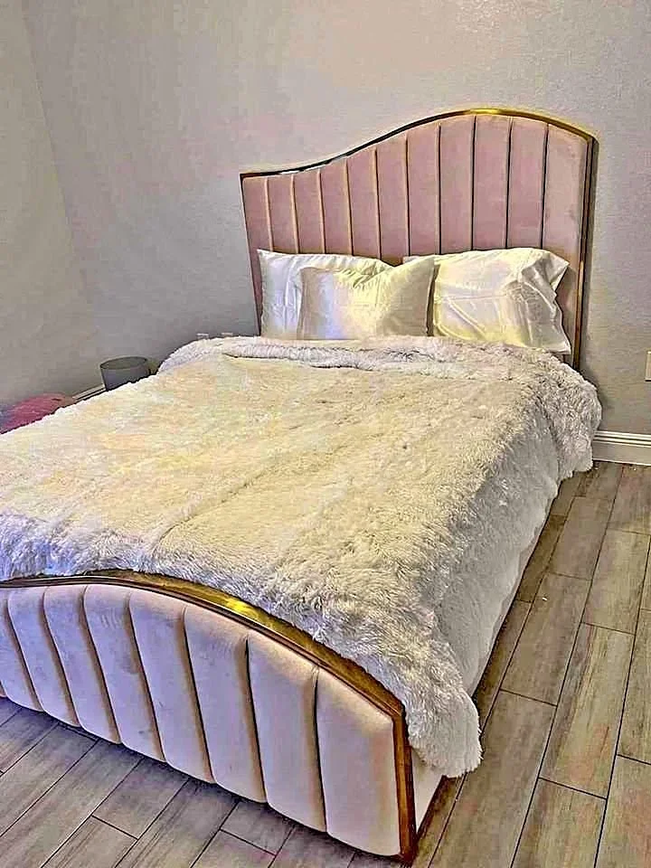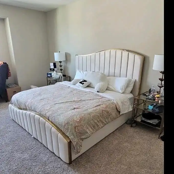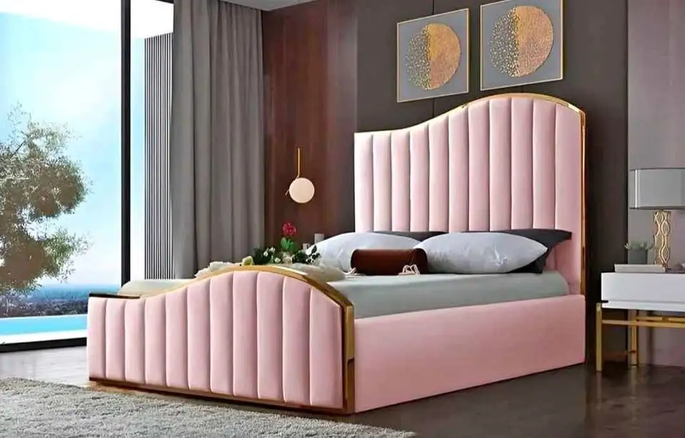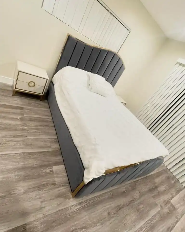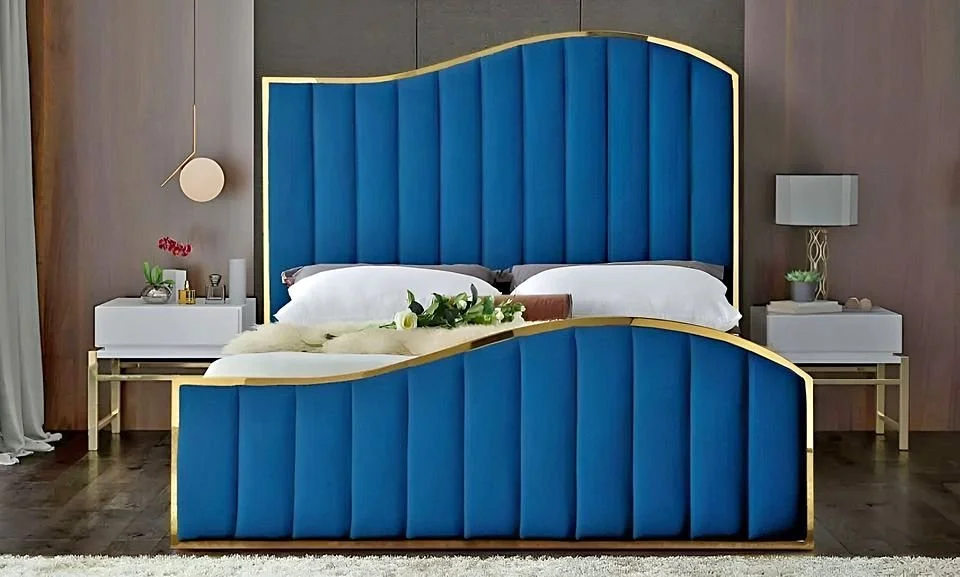 Redefine luxury with the Gold Line Wavy Headboard & Footboard Bed with Mattress and Storage. This masterpiece features a sophisticated wavy-edged headboard accented by sleek Gold Line metallic detailing, offering a high-fashion, contemporary look. The matching wavy footboard completes the seamless design, making it an ideal choice for those looking to add a touch of modern opulence to their bedroom.