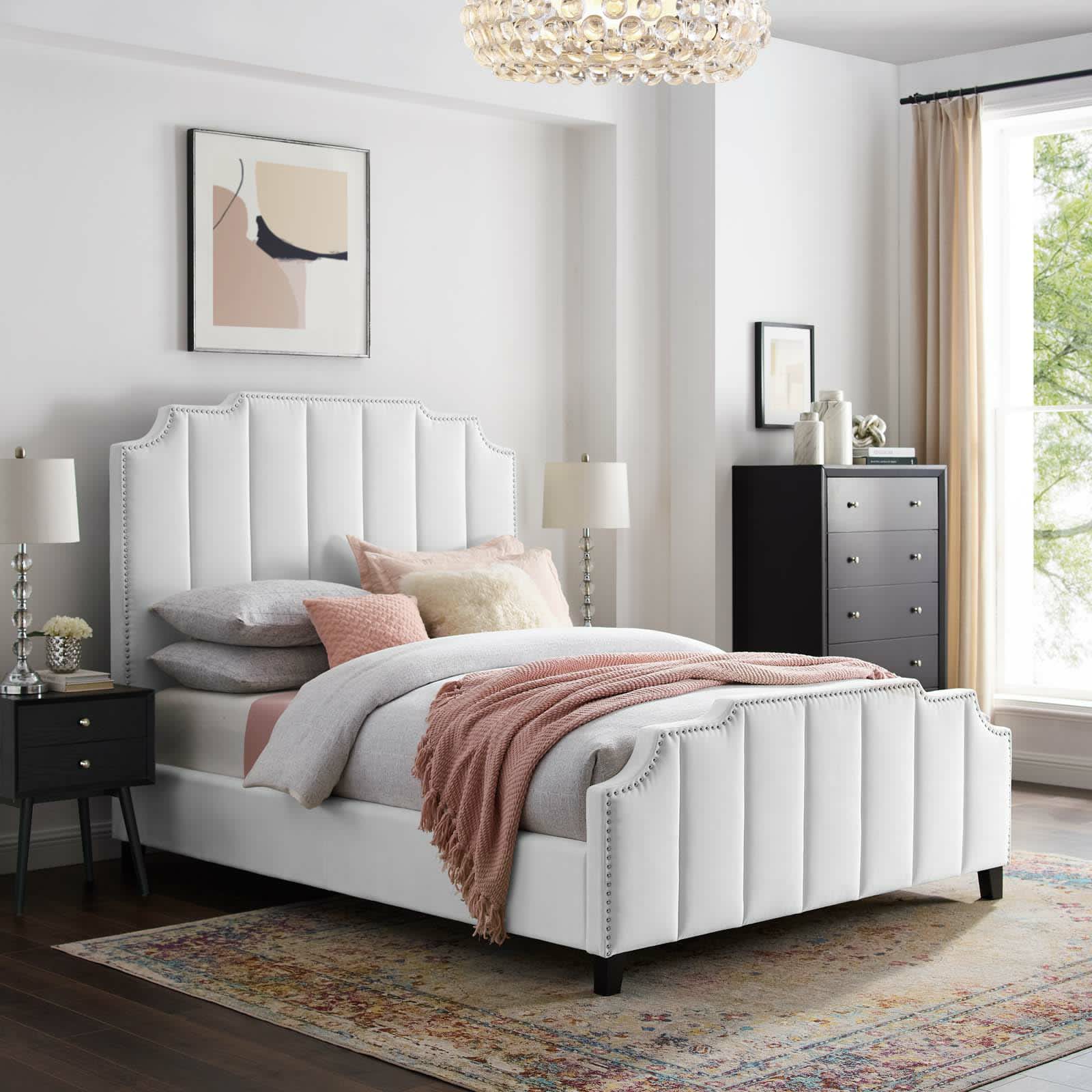 Arizona Bed: Modern, channel-tufted headboard & footboard in plush velvet. Features a chic, scalloped design and a sturdy, high-quality platform base. Sleep in style.
