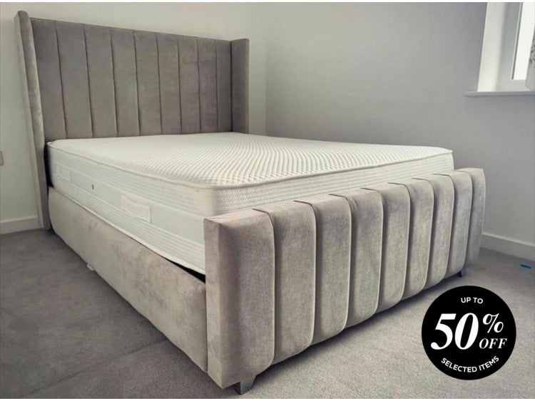Grand wingback headboard and bold vertical channeling define this luxury bed. Features a high, contemporary design and a sturdy, quality platform base.